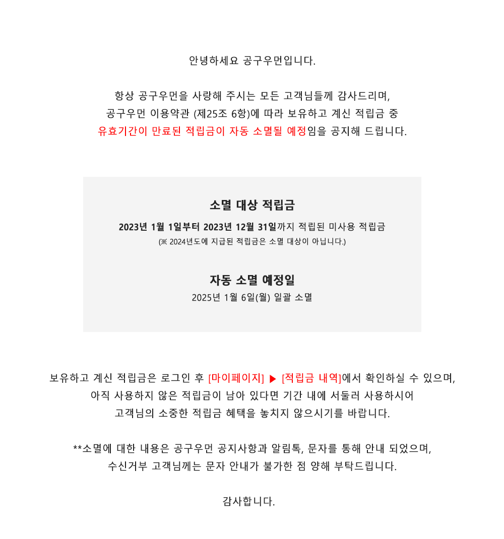 공구우먼 적립금 소멸 안내 (2025년 1월 6일 기준 소멸 안내) 공구우먼 | 2024-12-09