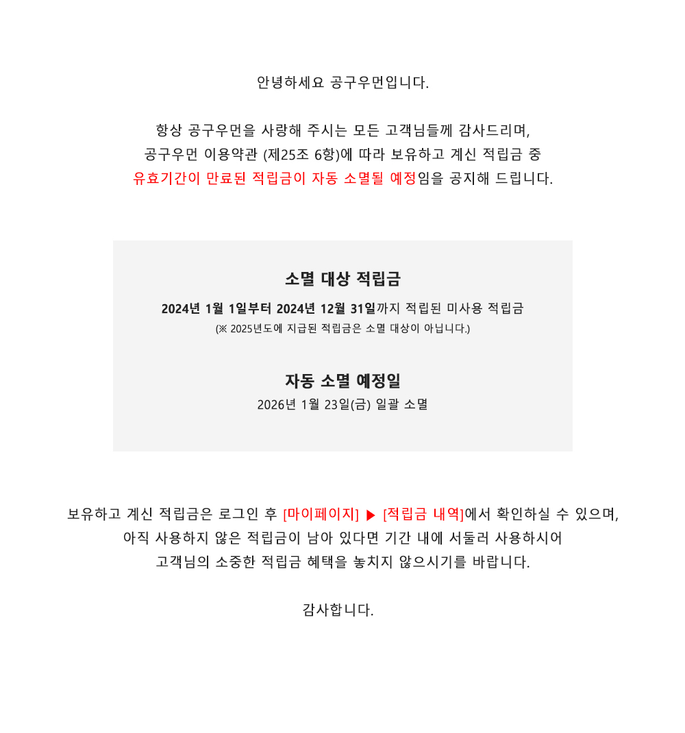 공구우먼 적립금 소멸 안내 (2026년 1월 23일 기준 소멸 안내) 공구우먼 | 2024-12-09