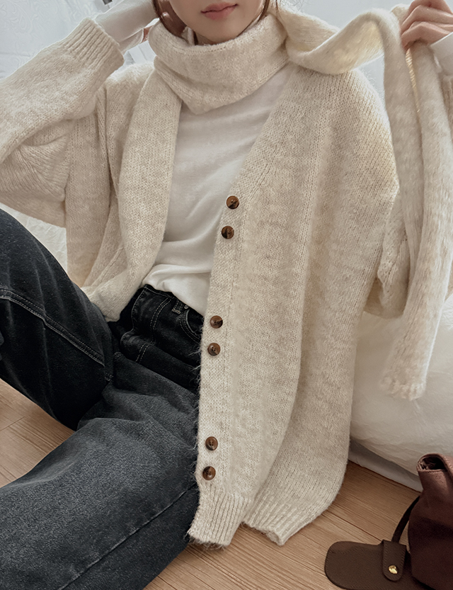 러비덥 브이넥 루즈핏 가디건 & 목도리 세트예요.