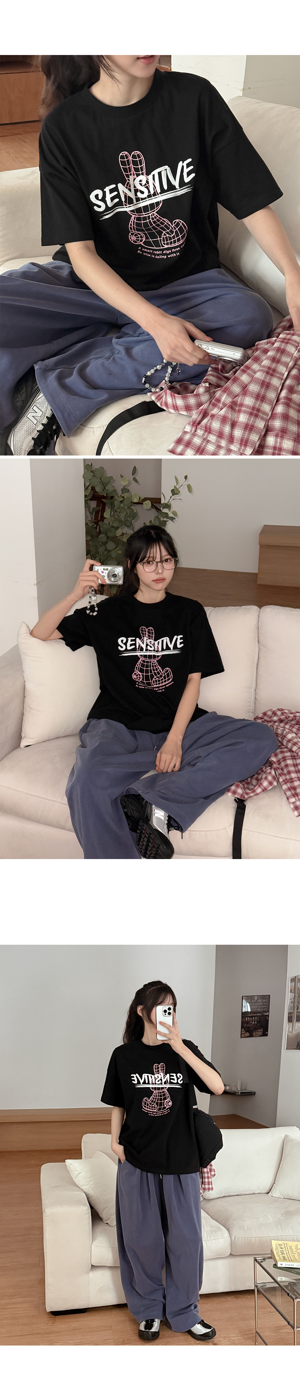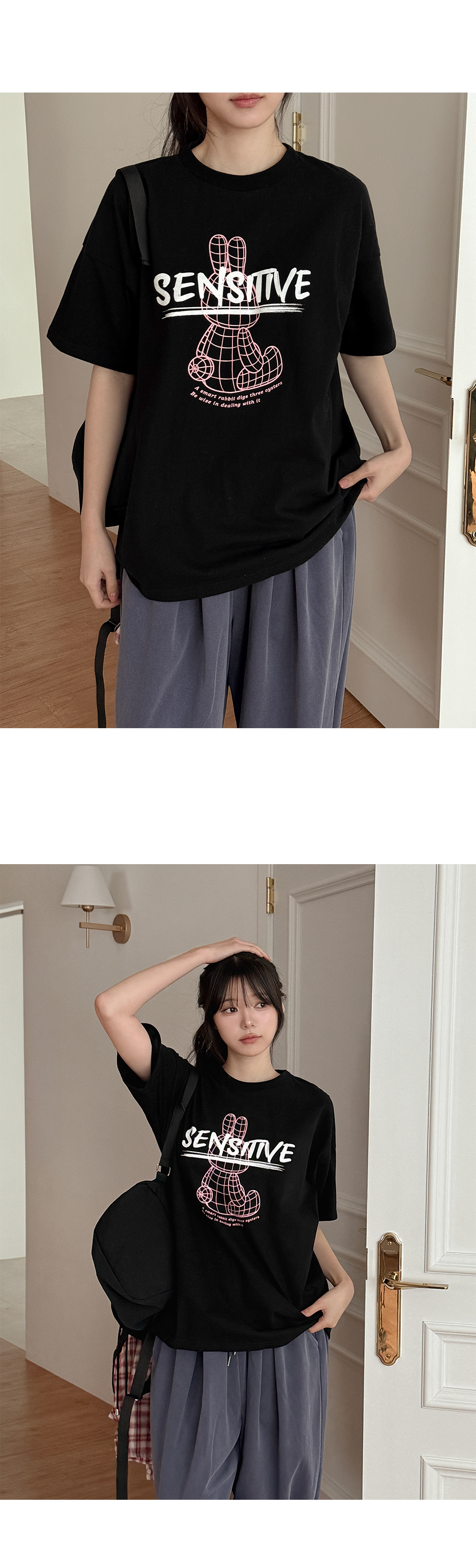 - 캐주얼한 포인트가 되어주는 토끼와 레터링 나염 디자인