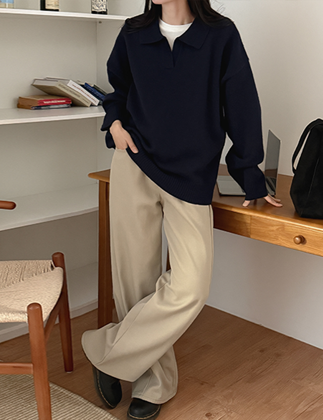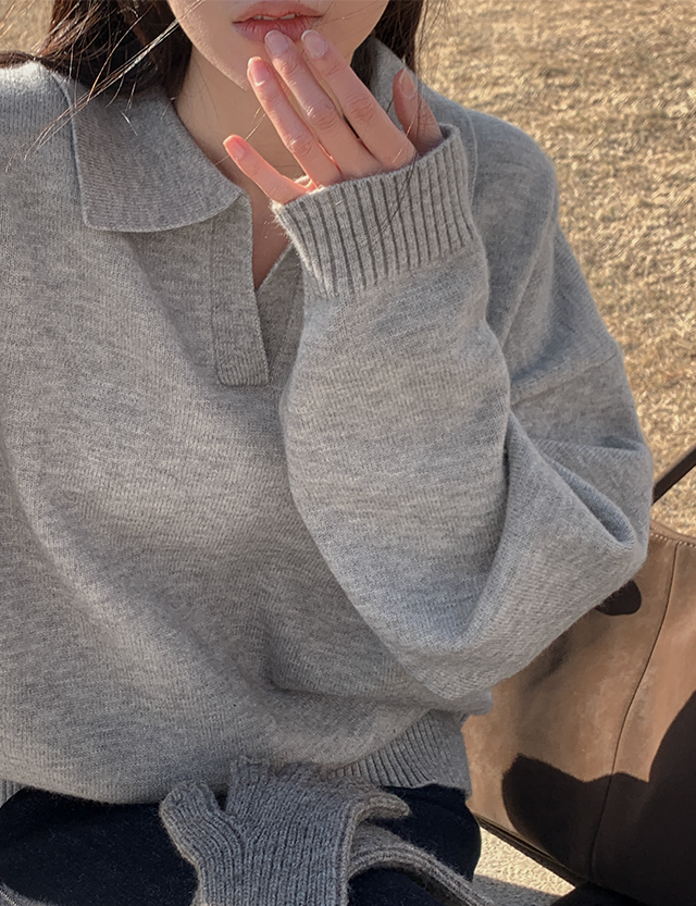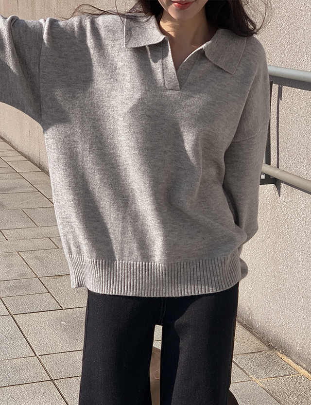 부드러운 터치감이 느껴지는 반오픈 카라 루즈핏 니트