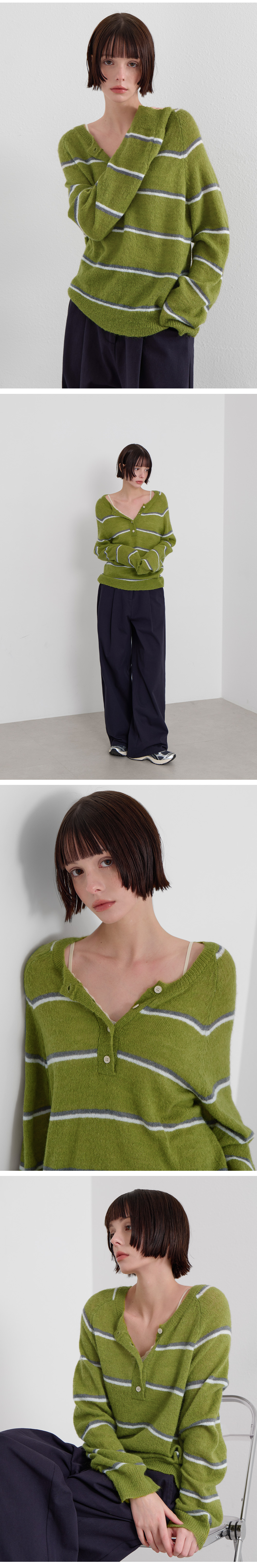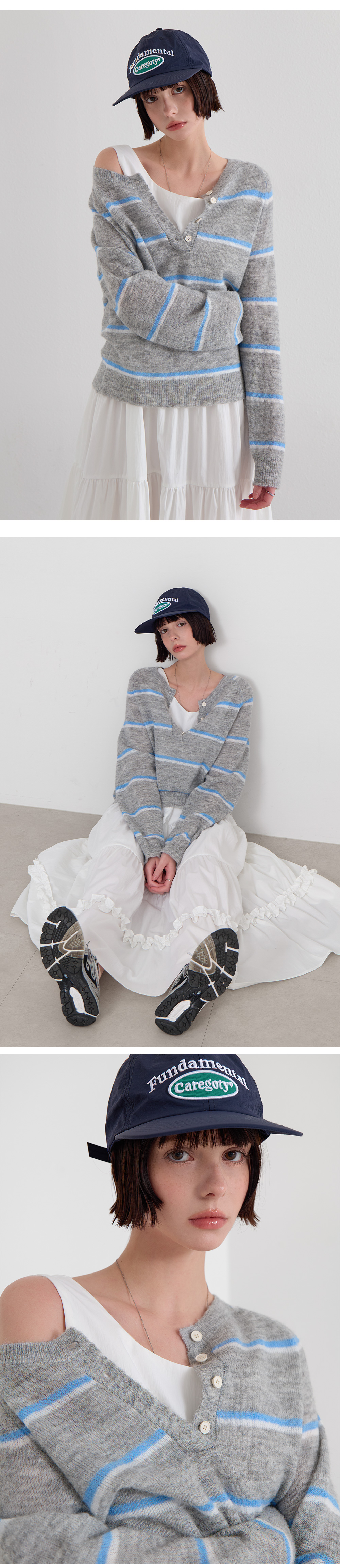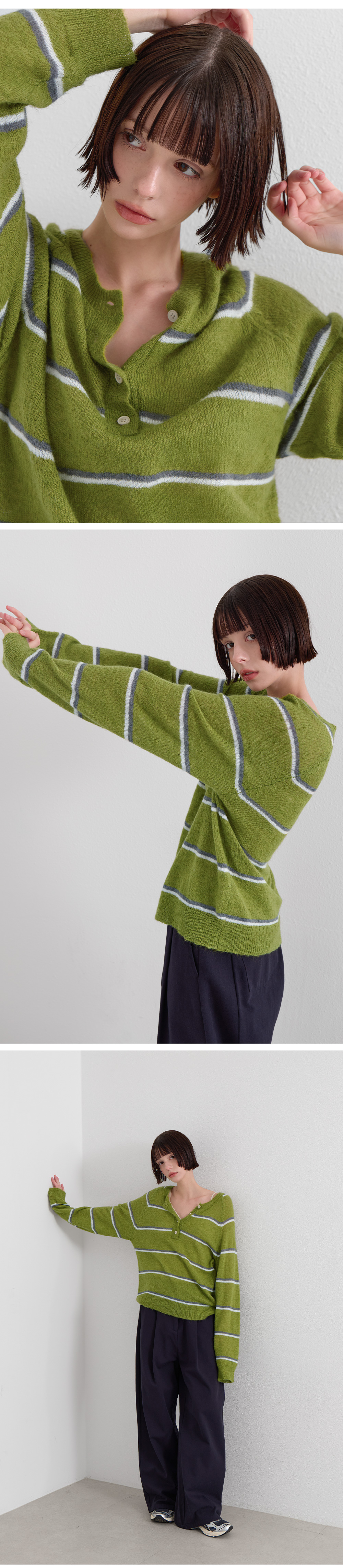 · 단추 디테일이 더해진 넥 라인으로 단독·레이어드 모두 쉬운 스타일링