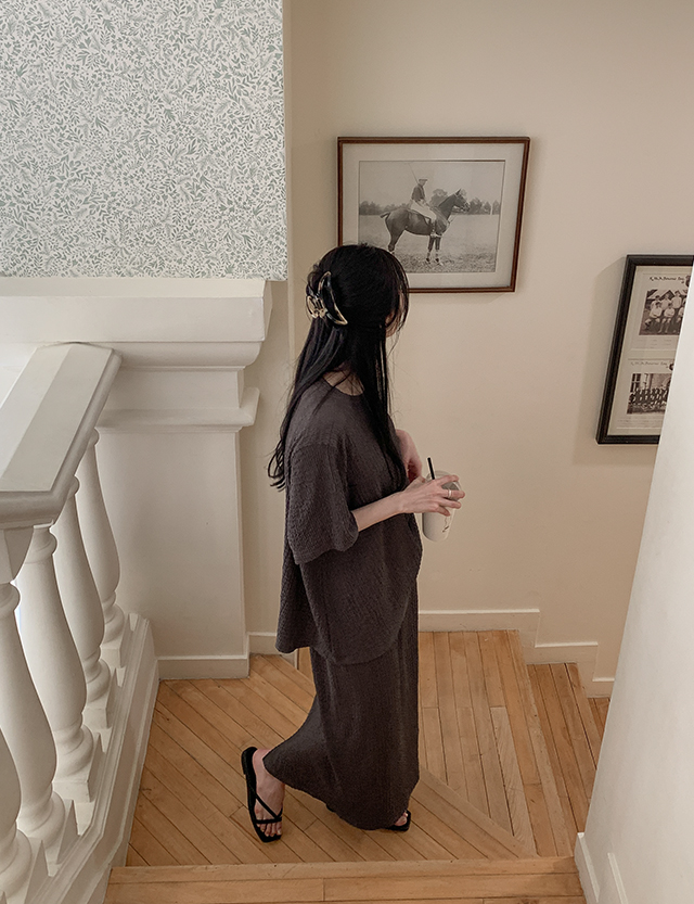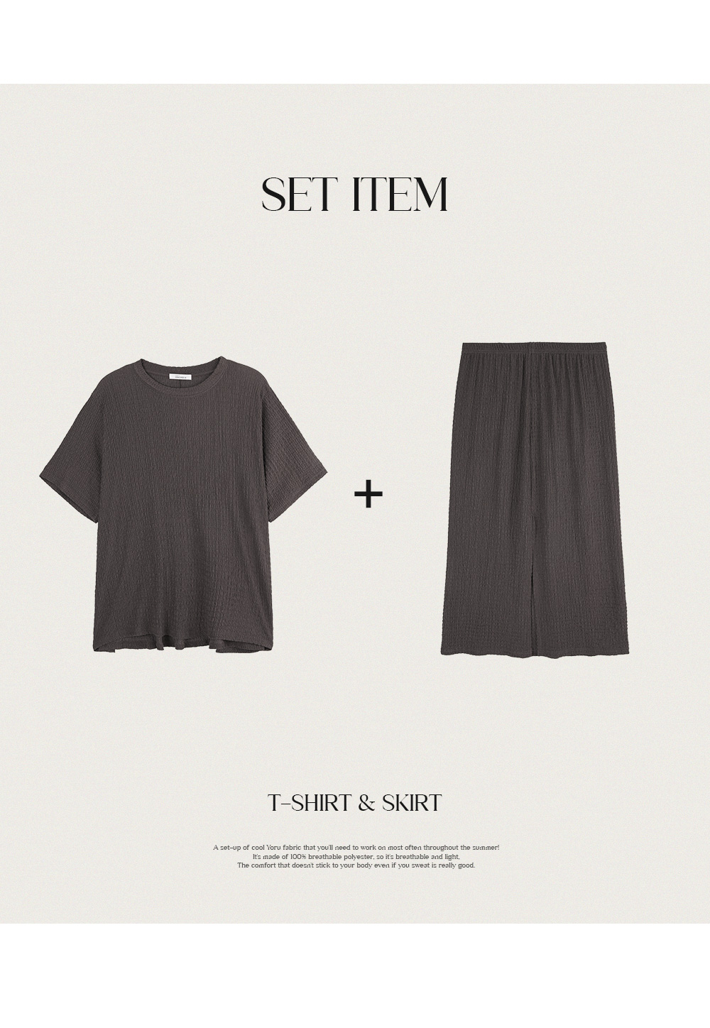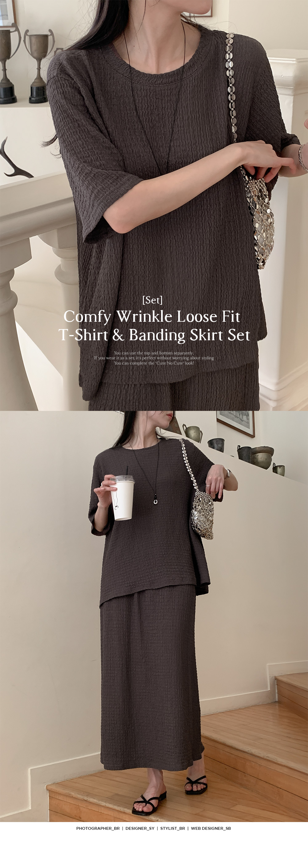 - 루즈하게 떨어지는 포인트의 티셔츠와, 롱한 기장감의 밴딩 스커트 셋업