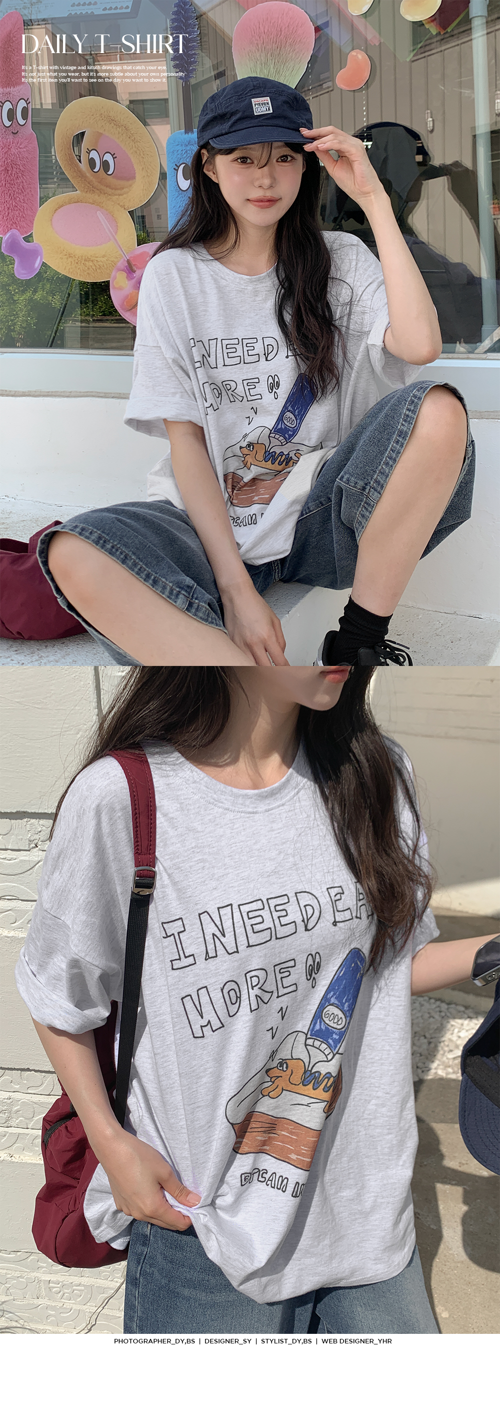 빈티지하고 키치한 드로잉이 시선을 사로잡는 티셔츠예요.