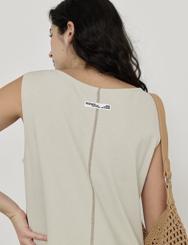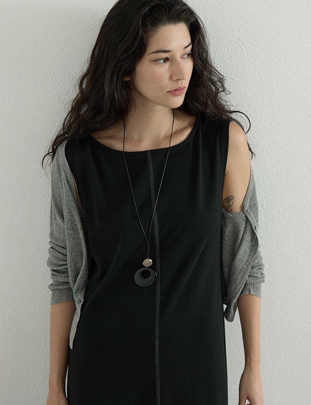 ·우아한 보트넥에 허리 라인을 잡아주는 스트레이트 실루엣으로 연출한 슬림한 효과