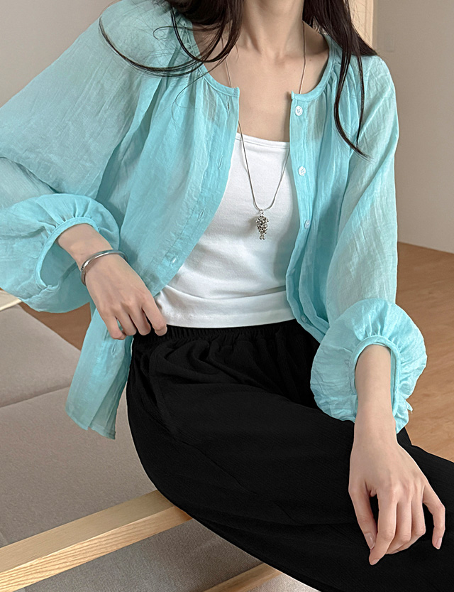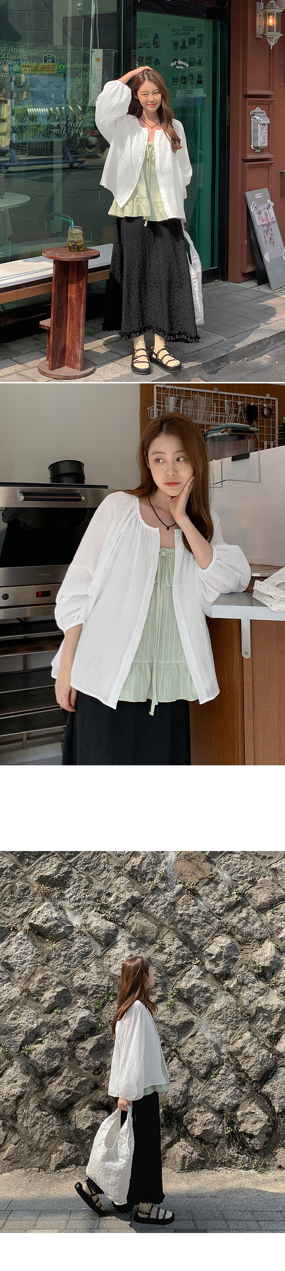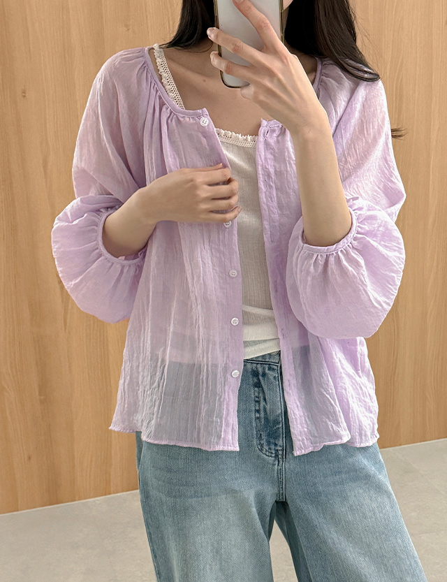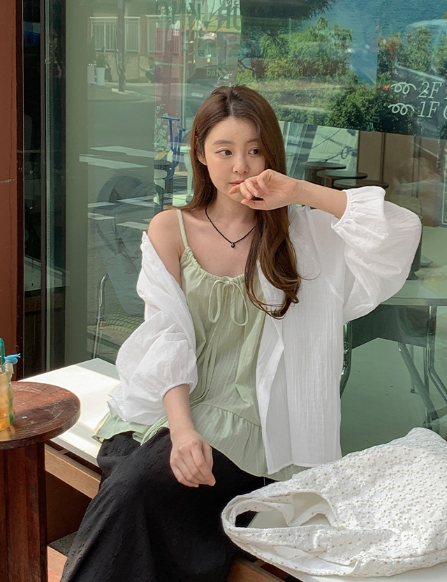 - 넥라인 셔링 디테일로 아방한 실루엣 연출