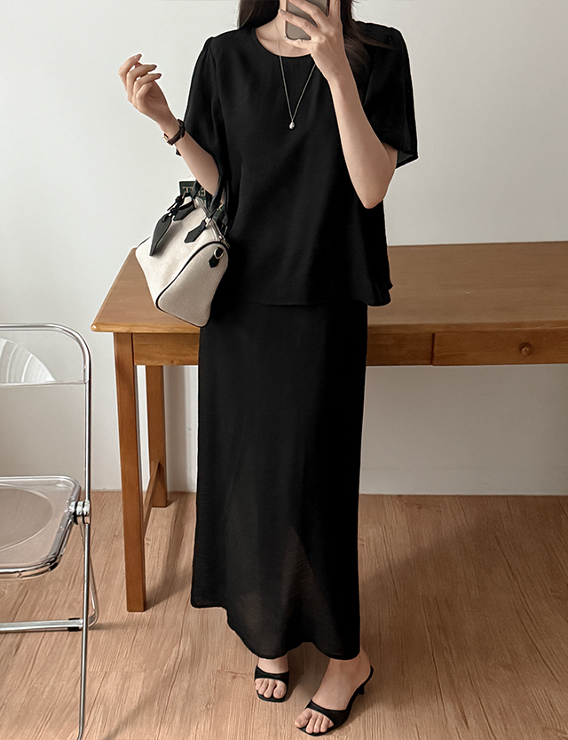 세미 A라인으로 퍼지는 스커트 라인이 하체를 단정하게 정리해 줘요.