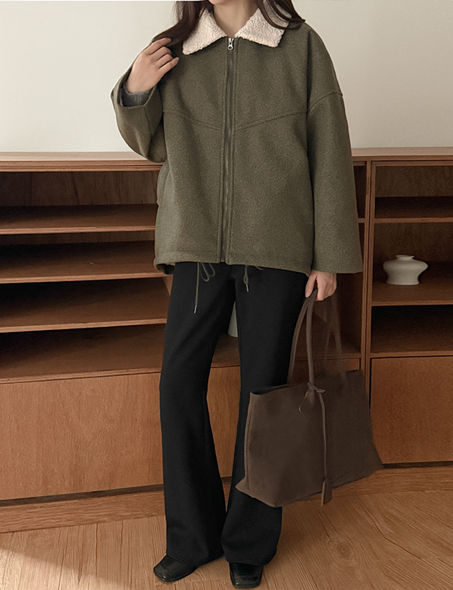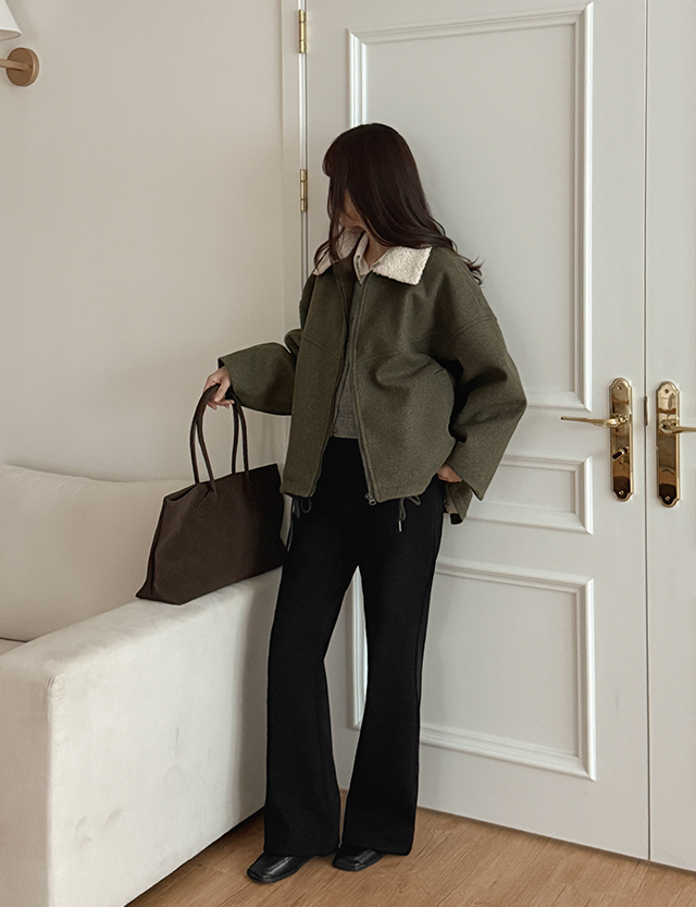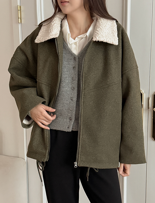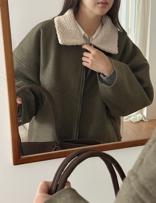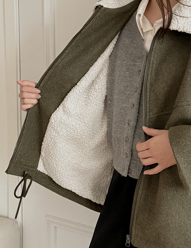 부클 퍼 카라로 포인트를 더한 울 집업 자켓이에요.