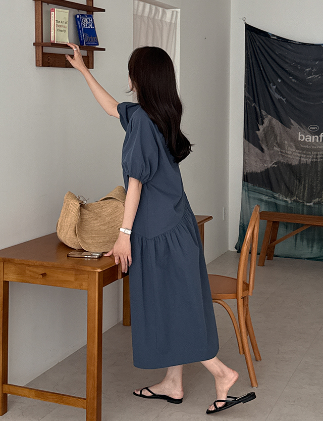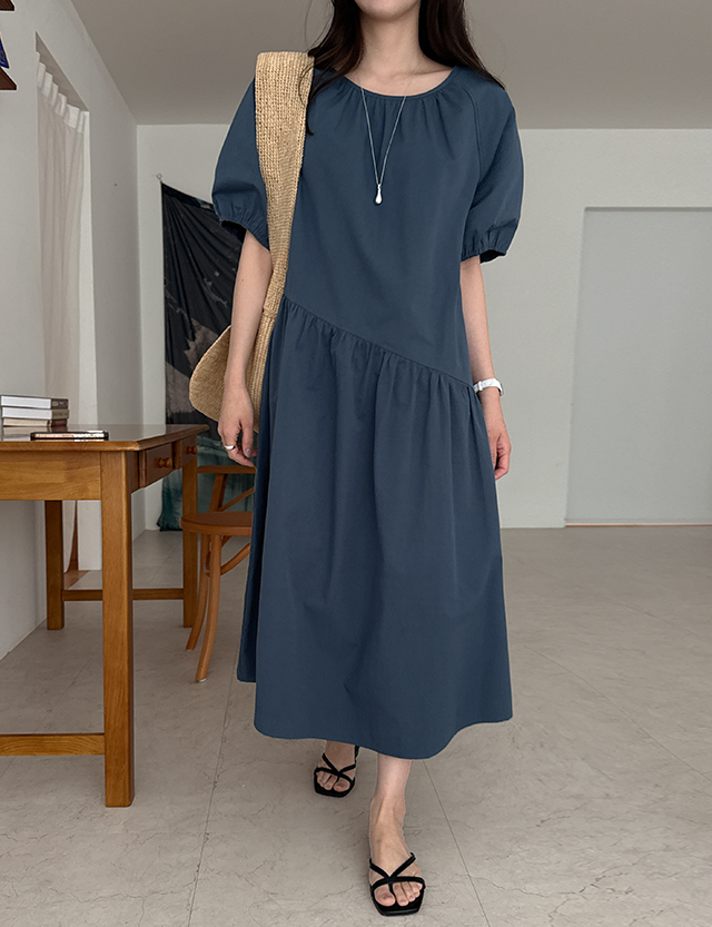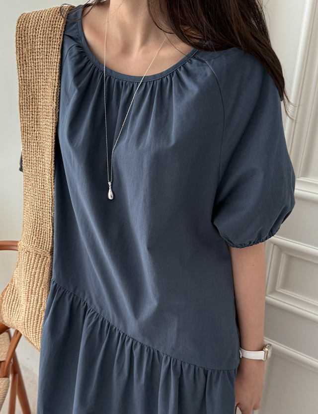 - 허리선을 사선으로 절개하고 풍성한 셔링을 더해