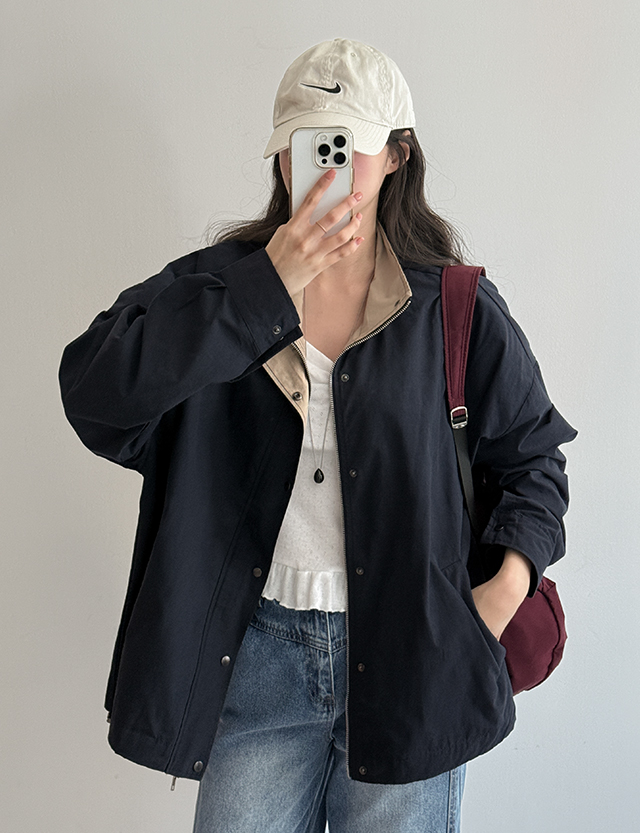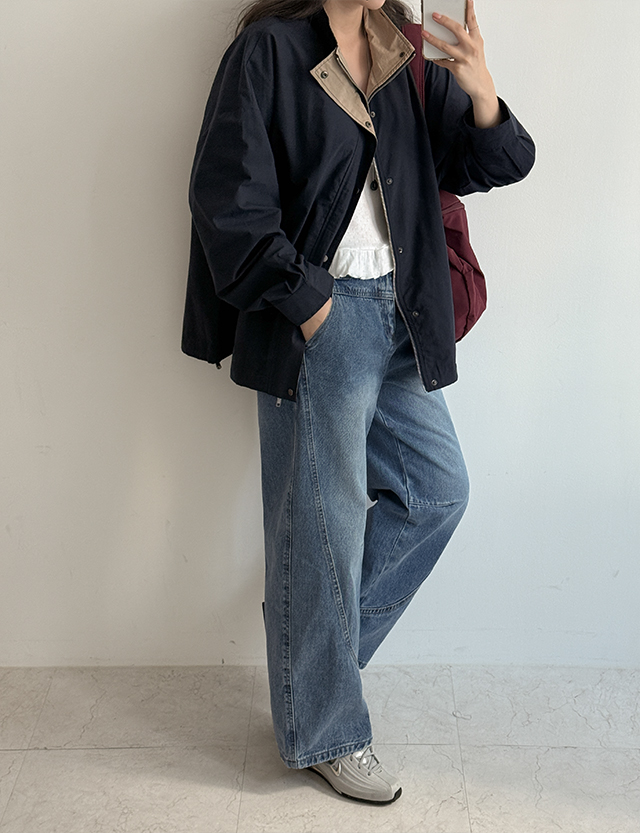 다빈 컬러 배색 밑단 스트링 루즈핏 자켓 87114