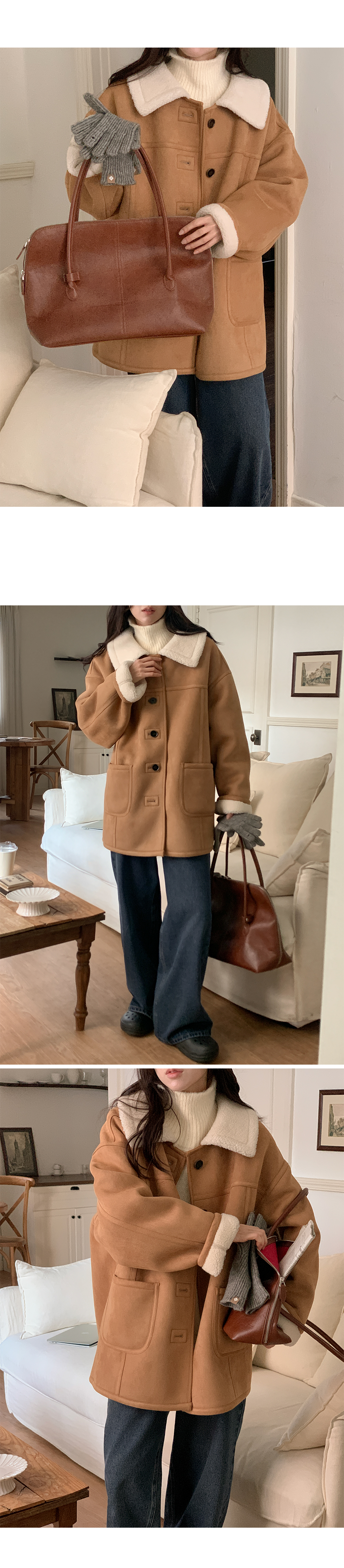단정한 분위기를 유지해 주며 카라까지 이어지는 양털 배색이