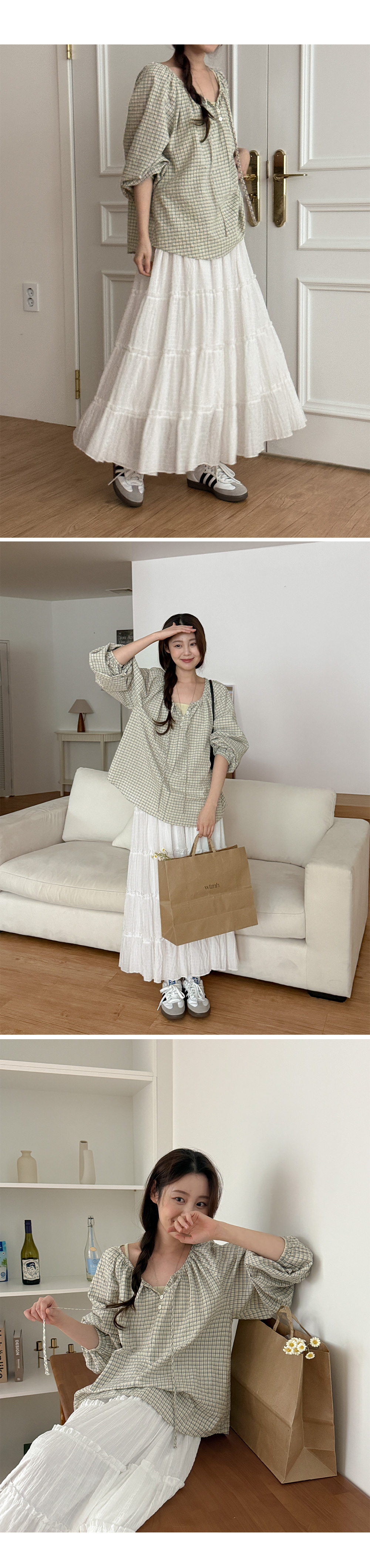 적당한 셔링분배로 부해보이지 않는 최적의 라인을 완성시켜준 스커트에요.