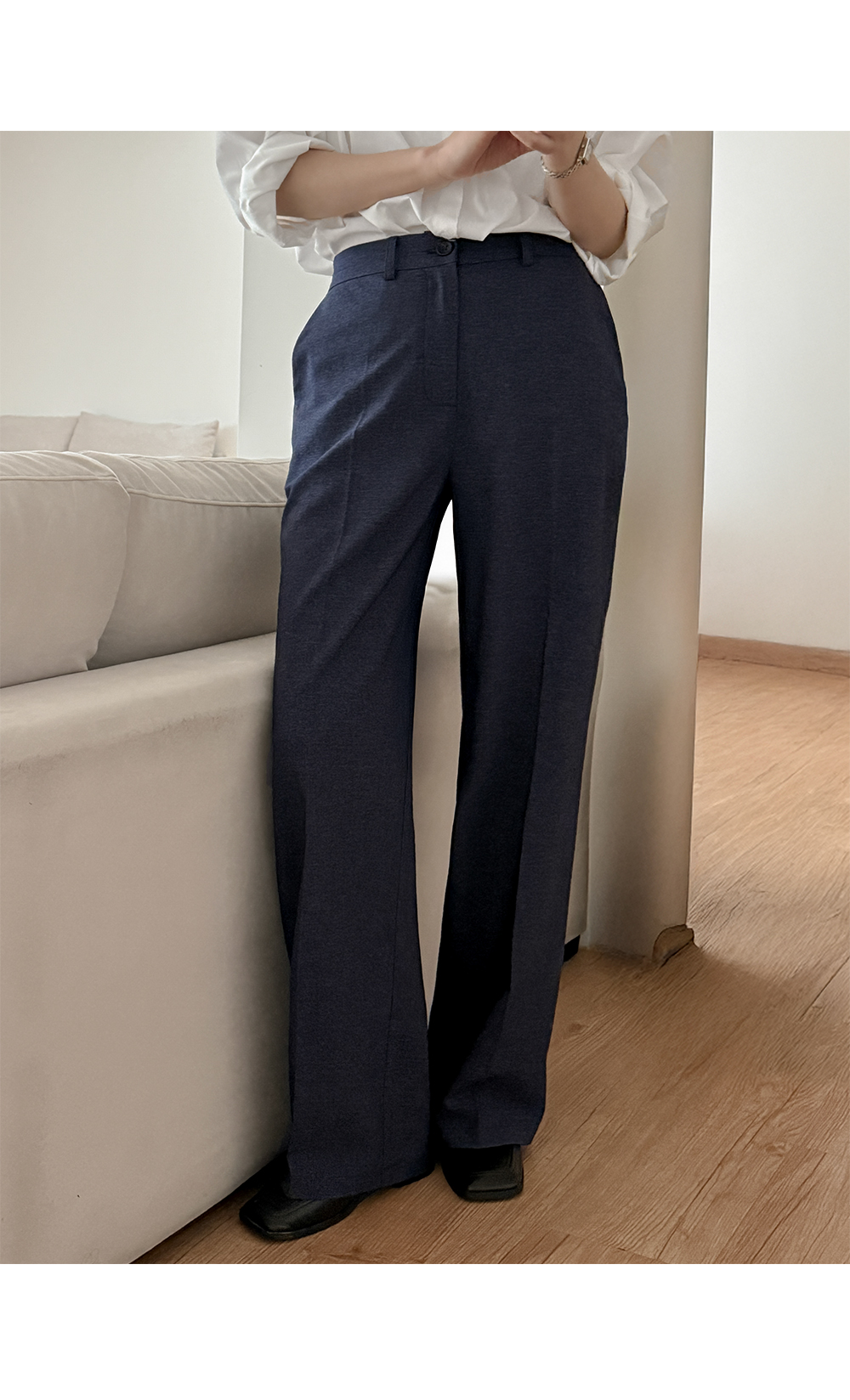 자칫 부해 보일 수 있는 세미와이드 핏을 깔끔하게 정돈해 주어,
