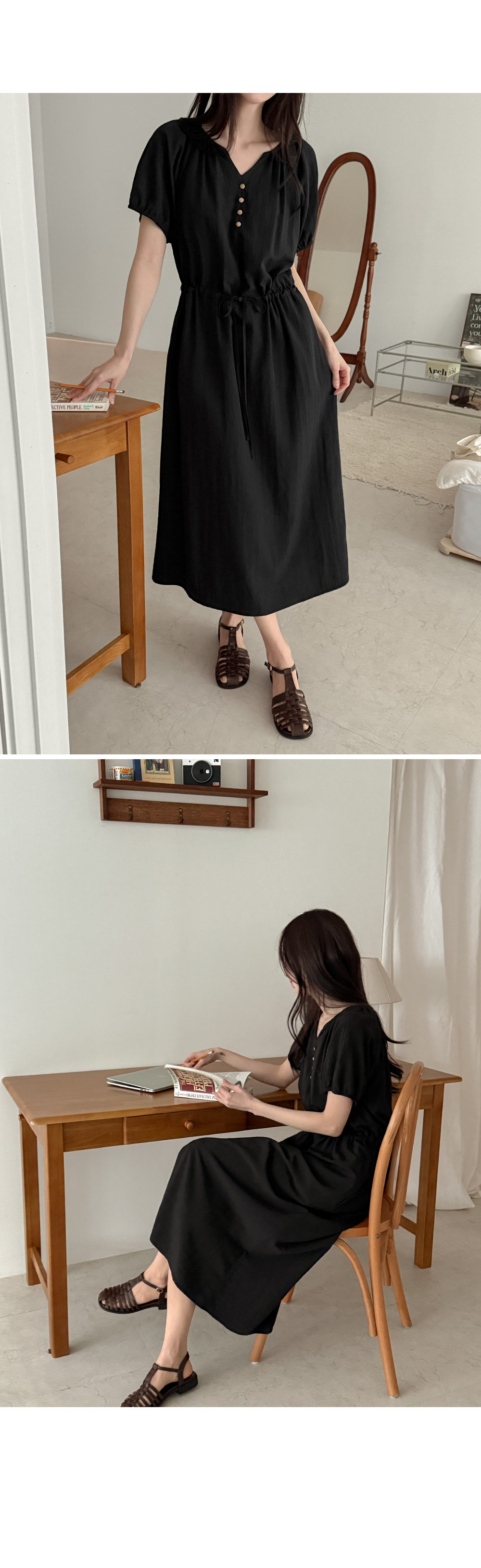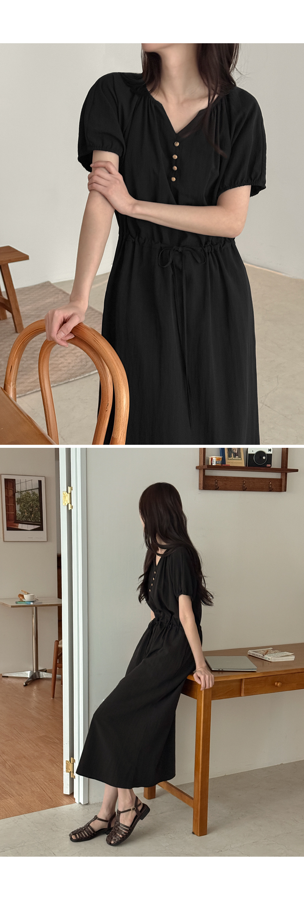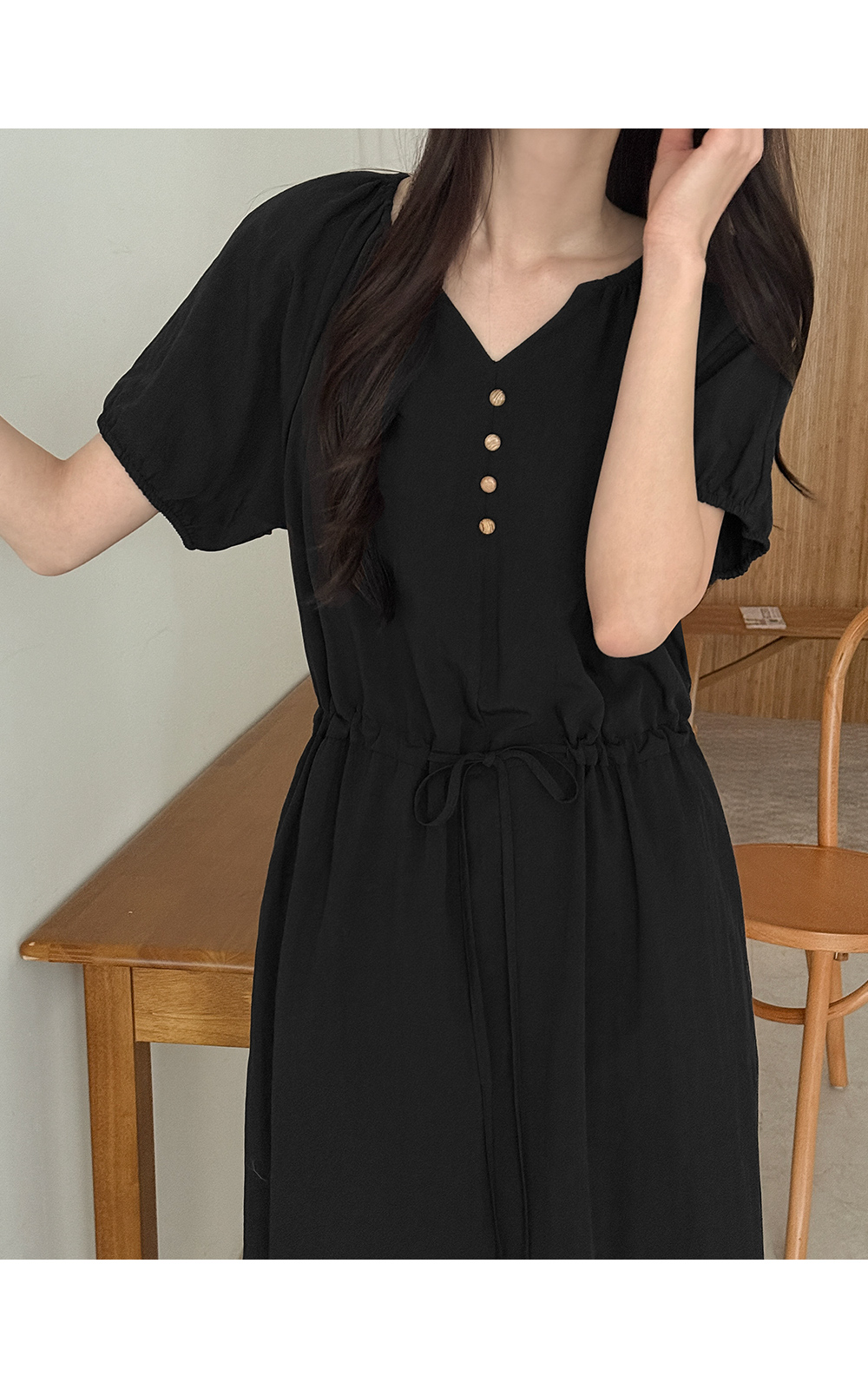 - 앞 중심에 더한 우드 단추 디테일로