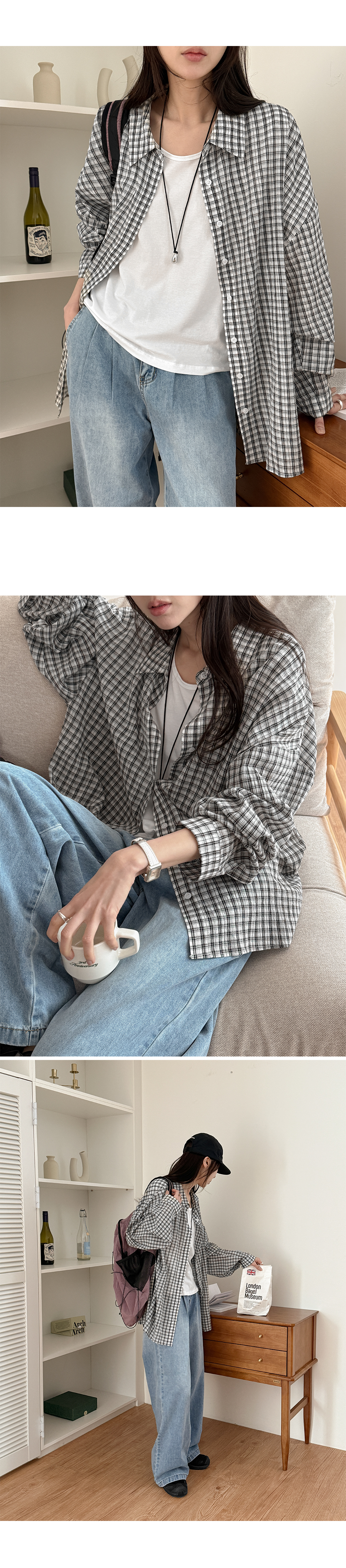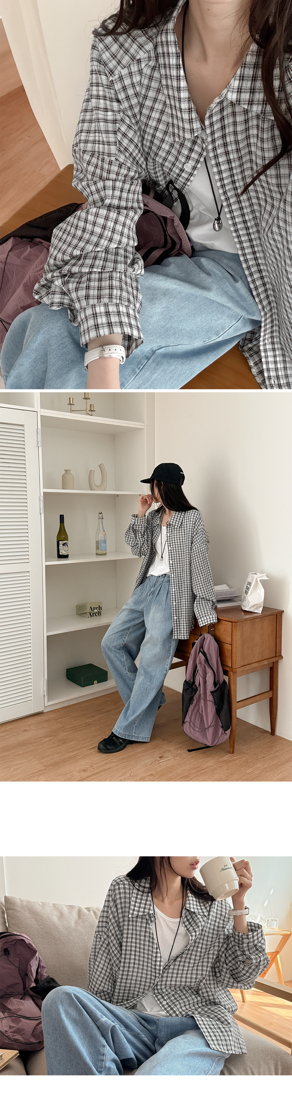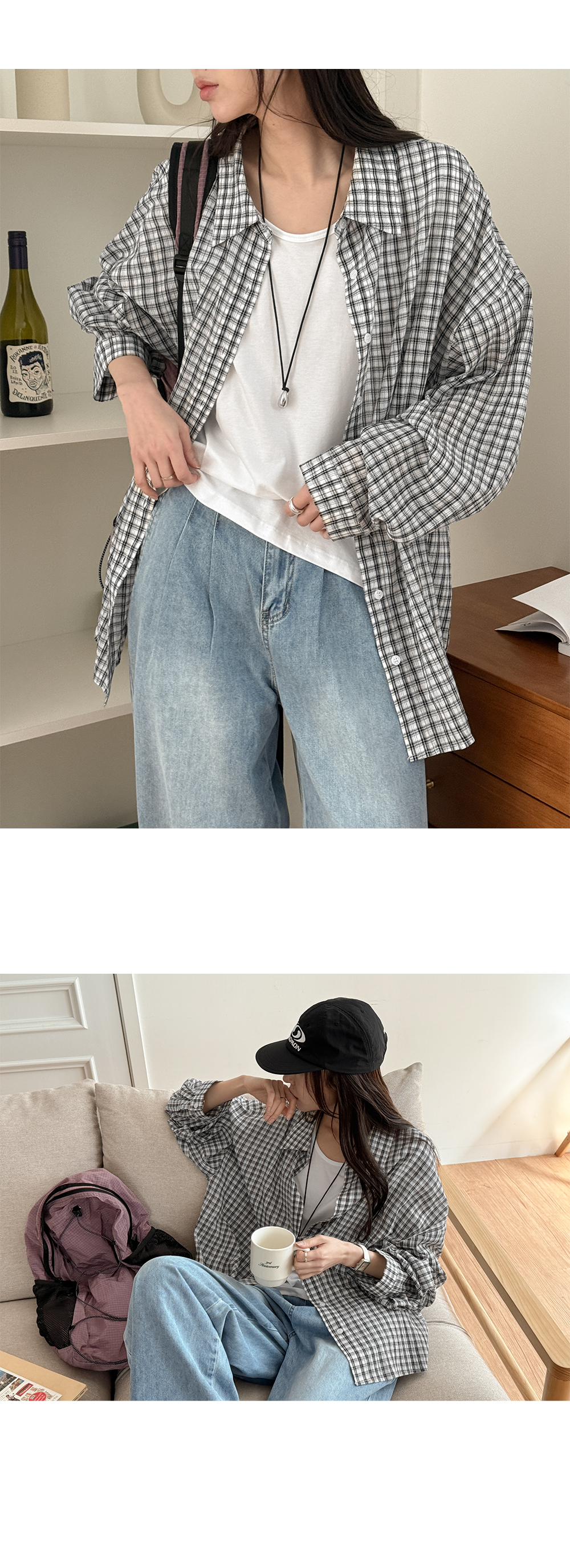 잔잔한 체크 패턴과 루즈한 실루엣이 어우러져