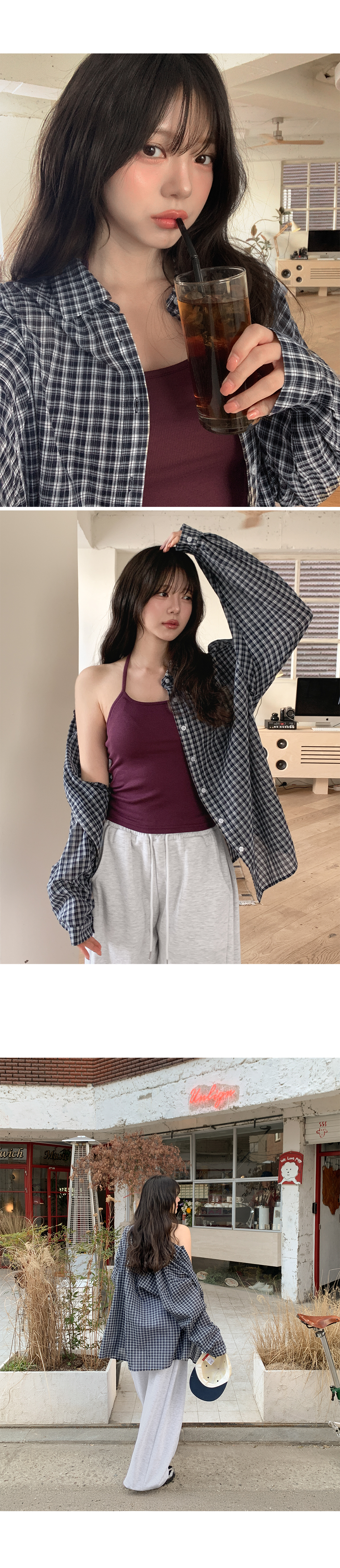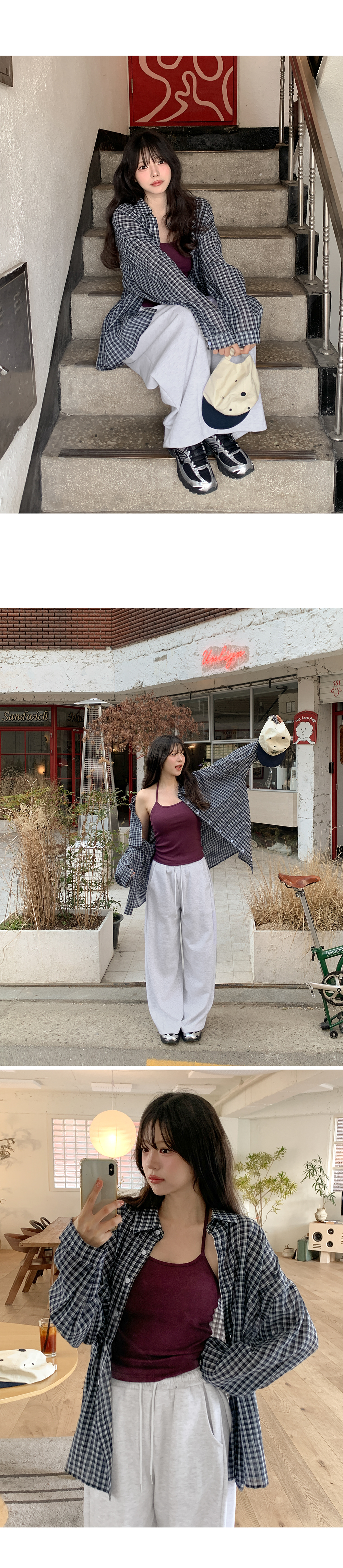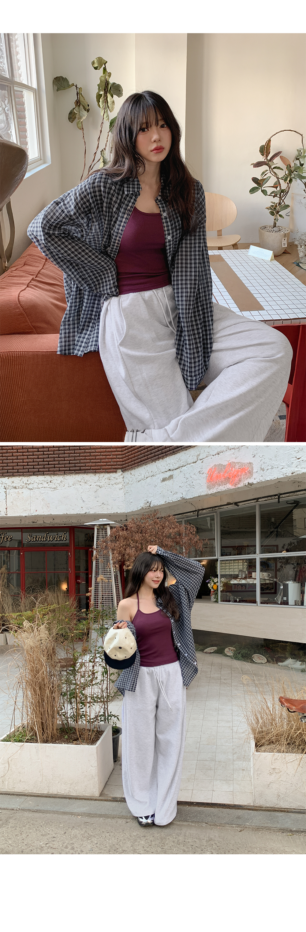 잔잔한 체크 패턴과 루즈한 실루엣이 어우러져