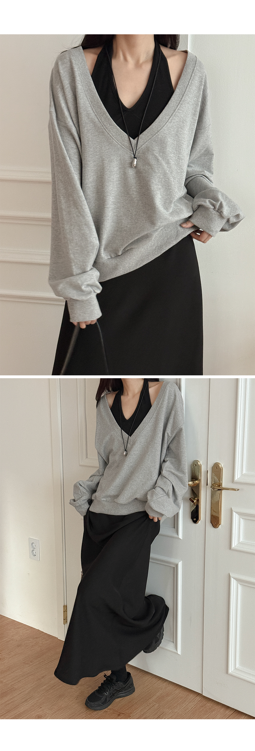 과감하게 파인 딥(Deep) 브이넥이 목선을 길어 보이게 하고,