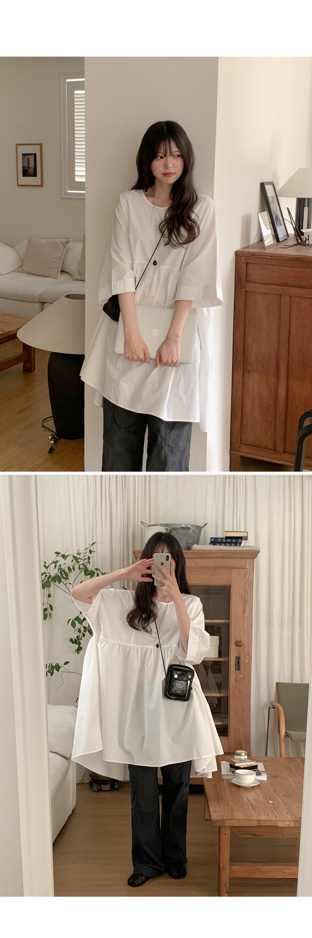 - 넓은 라운드넥 디자인에 뒷면 트임 버튼 디테일로